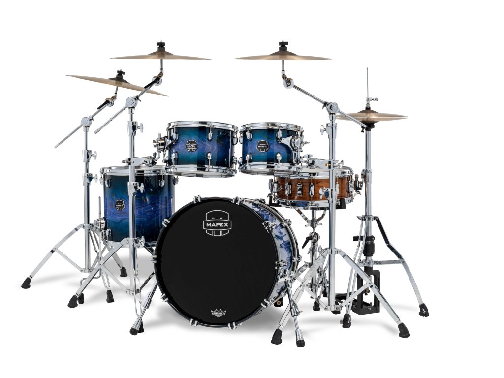 javor/ořech, 6,15mm tomy a snare (6 vrstev), 7,55mm bas. bubny (8 vrstev)